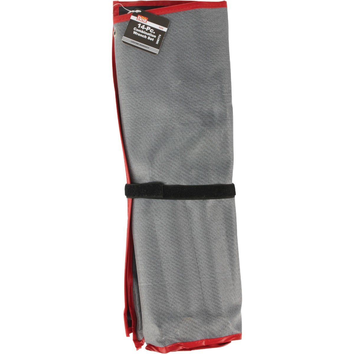 Economy priced wrench set. Chrome-plated carbon steel with raised panels. Includes 3/8", 7/16", 1/2", 9/16", 5/8", 11/16", 3/4", 13/16", 7/8", 15/16", 1", 1-1/16", 1-1/8", and 1-1/4" wrenches in vinyl roll-up pouch with cloth back.