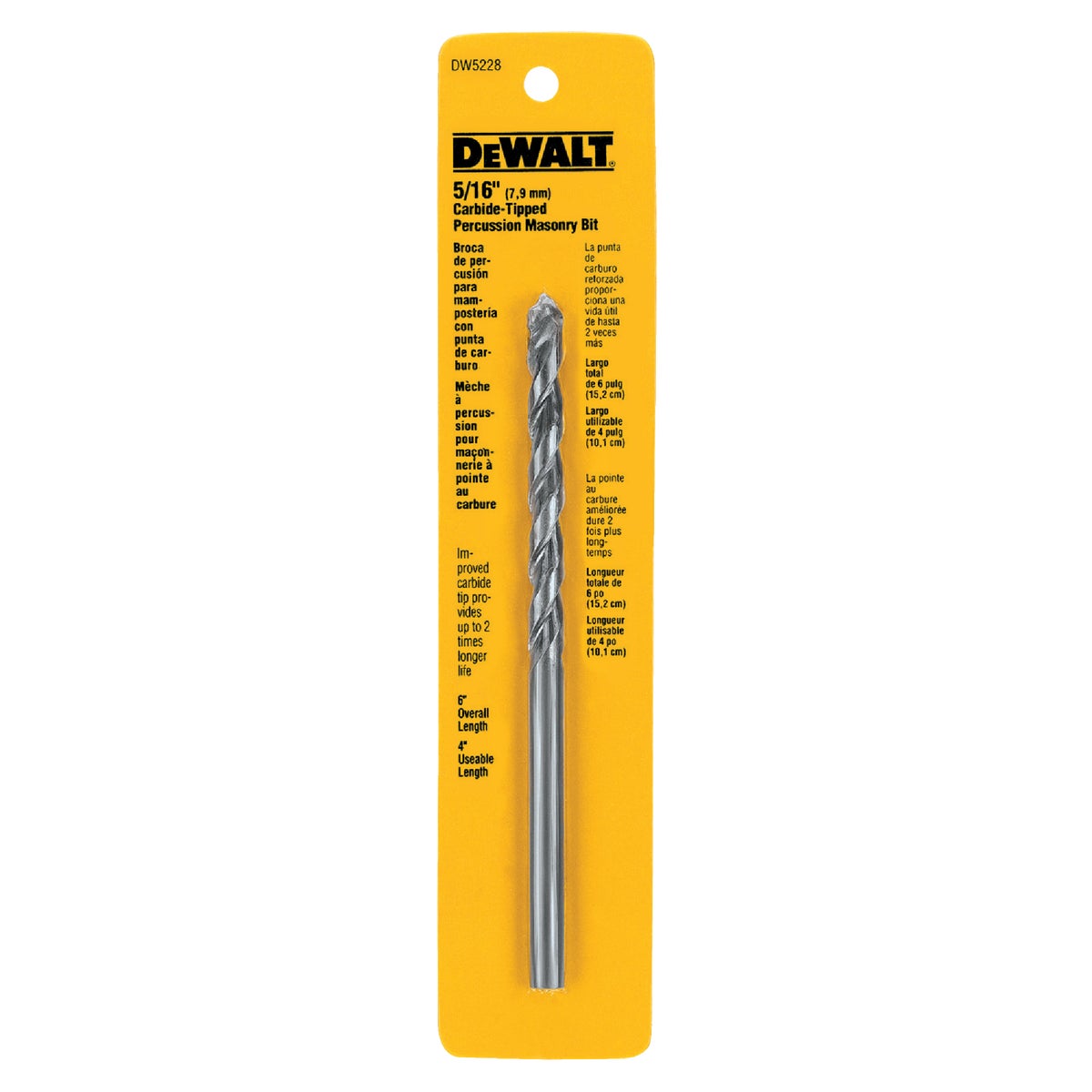 Piloted carbide tip design improves bit life. Hardened body for extra strength and reduced breakage. Four flute design provides efficient dust removal to reduce heat build-up also adding to bit life. Two cutter carbide tip maximizes carbide surface contact for longer bit life. For use in percussion and rotary drilling applications in rotary drills and hammer drills. 1 bit per pouch.