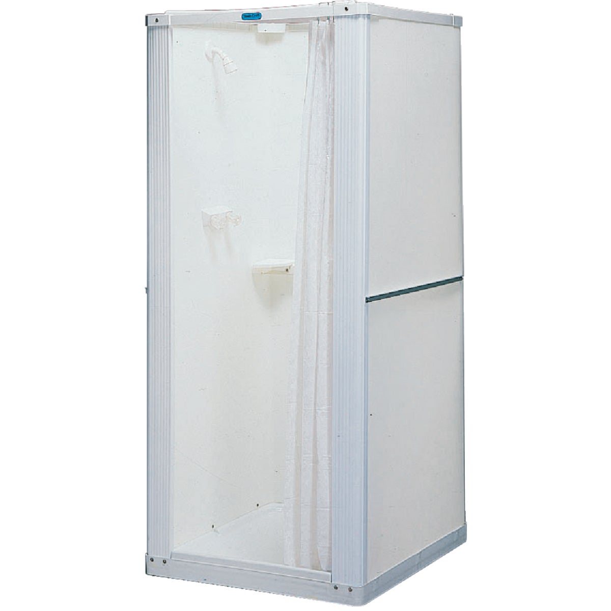 Free-standing (K.D. - knock down), economy model. Leakproof, rust-resistant, sturdy thermoplastic wall panels. Safety railing with soap dish and bottle holder. Includes nonmetallic valve assembly, drain, and curtain. 32-5/8" x 32-5/8" thermoplastic base x 74-3/4" H. Faucet may be installed either side. Packed in 1 carton. Door opening 24".