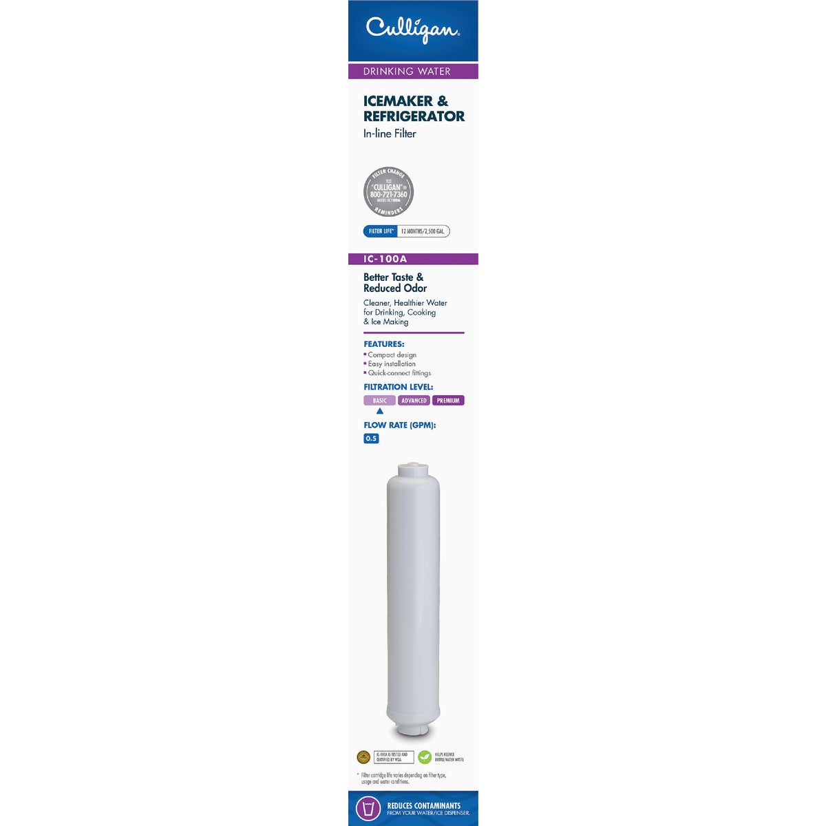 The Culligan filter is a level 1 drinking water filter that connects to the back of the refrigerator. It features granular activated carbon, which reduces unpleasant chlorine taste and odor resulting in cleaner, fresher-tasting water for ice cubes and beverages. Features include easy installation, compact design, and filter life of 12 months 2500 gallon. Package includes: Disposable filter, cartridge change reminder sticker.