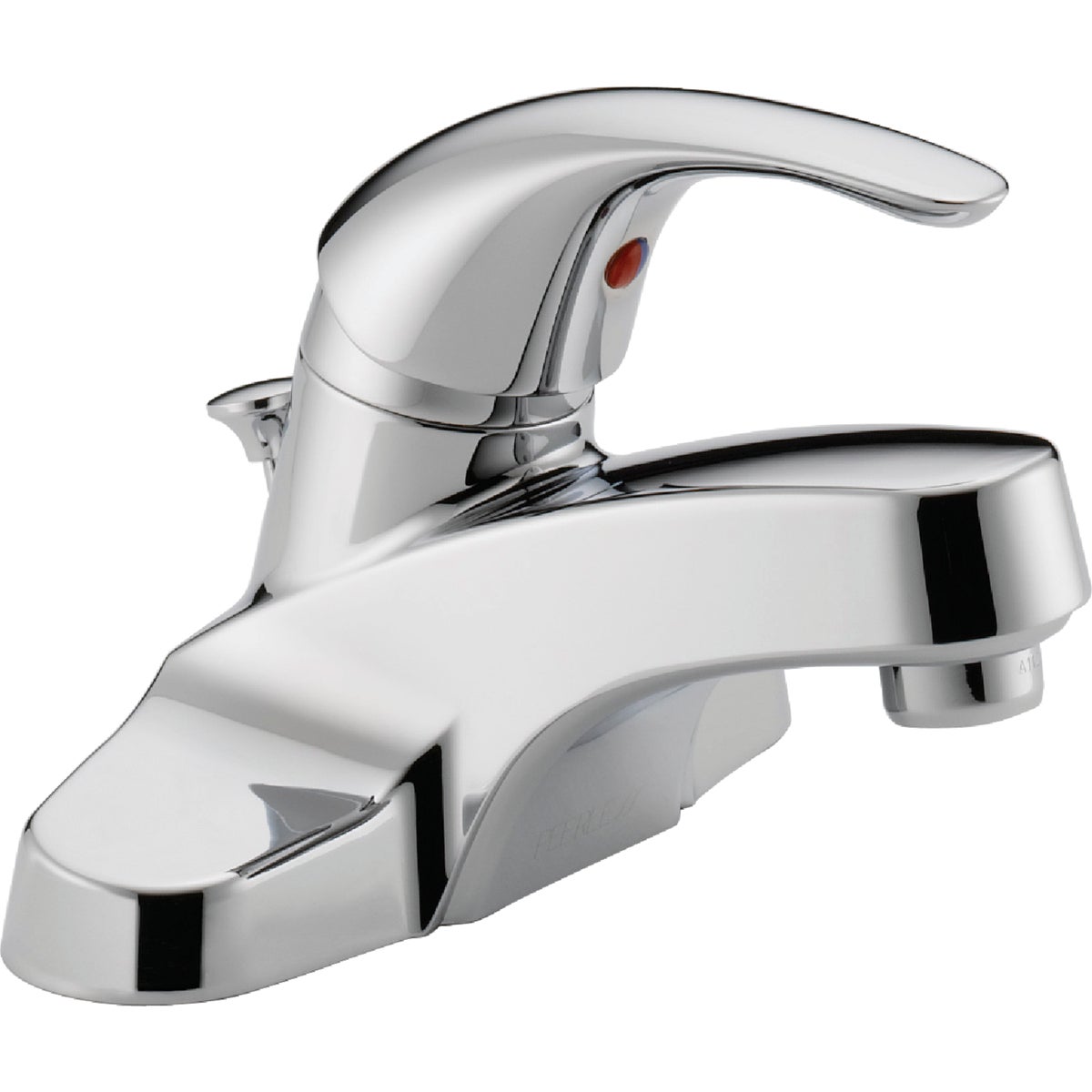 Choice series. Chrome finish. Lever handle, Three-hole 4" centerset installation, pop-up. 1.2 GPM (gallons per minute) flow rate, at 60 psi (pounds per square inch) 1/2" I.P.S. 1-1/2" deck thickness. ADA compliant. WaterSense labeled product. Lifetime faucet and finish warranty to the original consumer purchaser to be free from defect in material and workmanship.