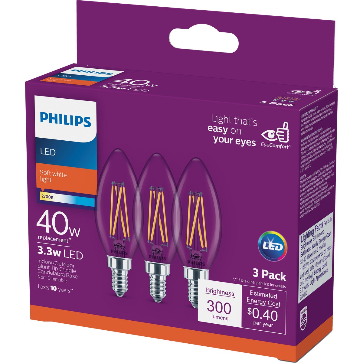 LED (light emitting diode) candle shape, blunt tip B11 light bulb with a candelabra base. Radiates a clear, white light ideal for use in kitchens, dining rooms, family rooms, bedrooms, and foyers. Provides a bright white light to enhance decorative fixtures, ceiling fans, and vanities.