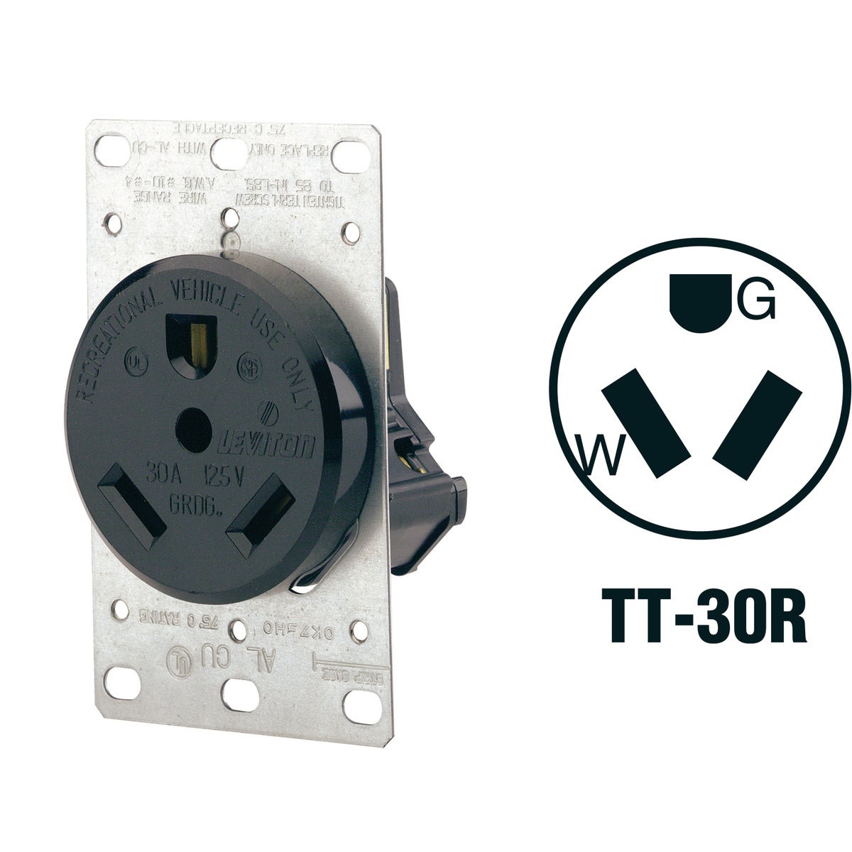 30A flush mount travel trailer replacement outlet with receptacle mounting plate. 30A/125V. UL (Underwriter's Laboratories) listed. For travel trailer use only. Diameter 2.15-inch. NEMA TT-30R.