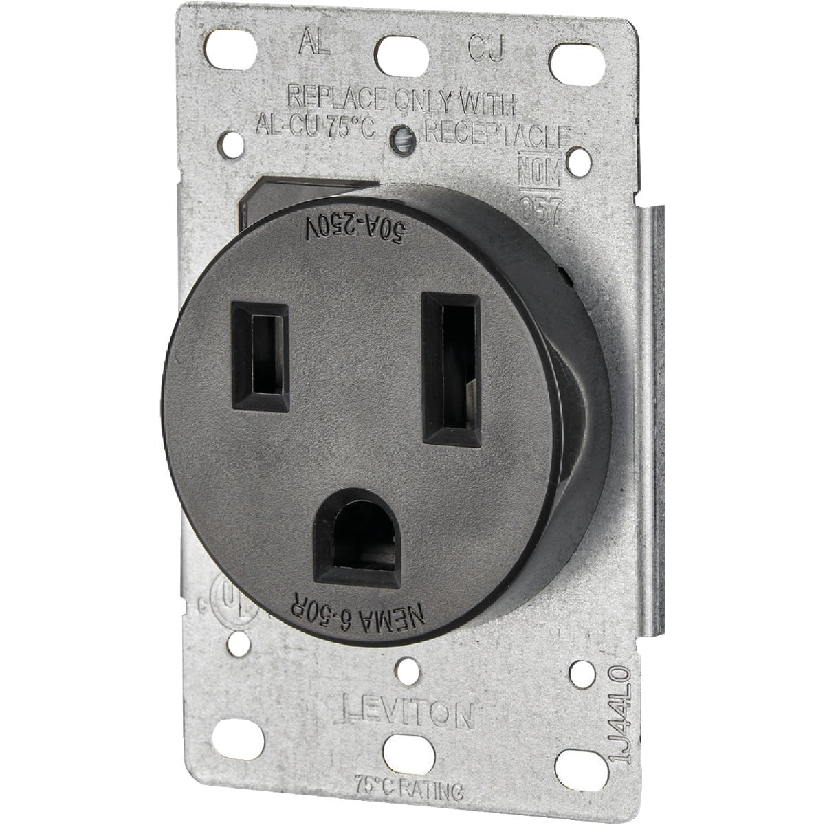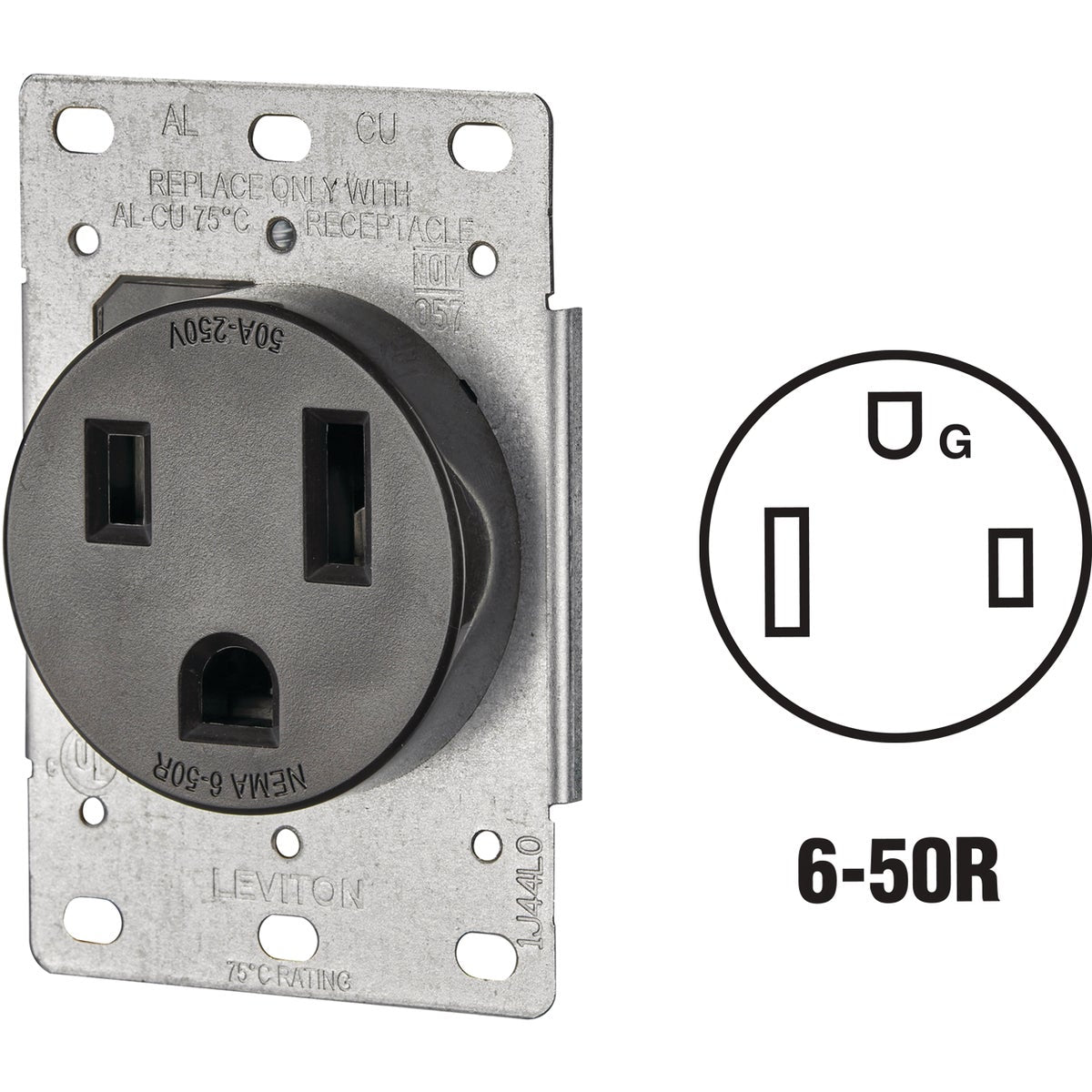Power grounding outlet ideal for use with welders. 2-pole, 3-wire. UL (Underwriter's Laboratories) listed to accept aluminum or copper conductors. Maximum 4 AWG (American Wire Gauge). 2.15 inch diameter. 50 amps/250 volts. Black. NEMA (National Electrical Manufacturer's Association) 6-50R.