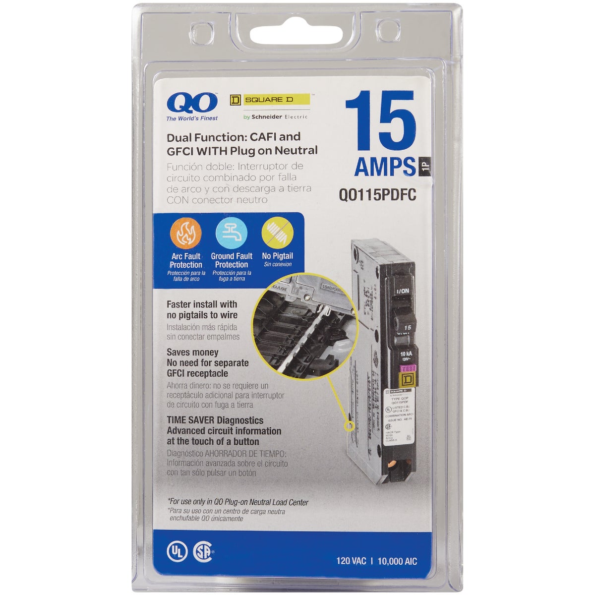 QO 1-pole plug-on neutral dual function circuit breaker. Space and labor saving device, engineered to meet prevailing NEC requirements. This device combines two critical technologies; Combination Arc Fault protection and Ground Fault protection (class A), in a single, easy-to-install device. The NEC now requires both combination arc fault and ground fault protection on all 1-Pole, 15-Amp and 20-Amp kitchen and laundry circuits. Prior to the release of this new device, a contractor or homeowner's only choice would have been to use a combination arc fault circuit breaker in conjunction with an expensive, bulky ground fault receptacle. Dual function circuit breaker helps reduce cost and eliminates the hassle of using two separate devices to provide this essential protection. Designed for reliability, connects directly to the neutral bar, providing a time and labor-saving installation. Several advantages from the plug-on neutral design are fewer connections which lead to faster installation and an innovative neutral clip eliminates pigtails which in turn frees gutter space. Integrated with time saver diagnostics, a unique feature that provides additional circuit information and minimizes troubleshooting at the touch of a button.