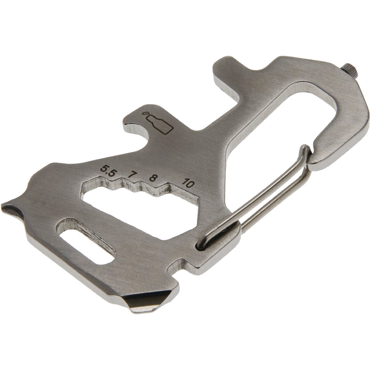 Small, compact multi-tool easily attaches to keychain, bags, belt loops, or EDC kits. Stainless steel construction. 11 functions include 4-size spanner wrench, glass breaker, bottle opener, Phillips and flathead screwdrivers, carabiner clip, cell phone stand, spoke wrench.