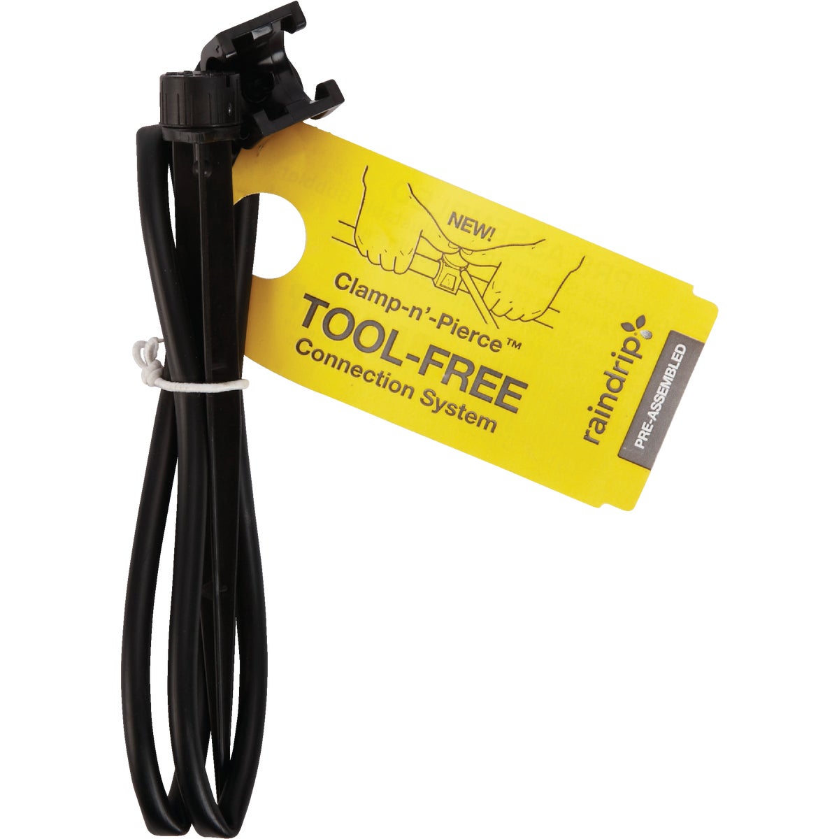 Adjustable stream spray bubbler. GPH (gallons per hour) can be adjusted. Comes pre-assembled on a 6 In. high stake with 2 Ft. long 1/4 In. feeder hose. Complete with Clamp N Pierce assembly. Ready-to-install on existing supply line. No tools required.