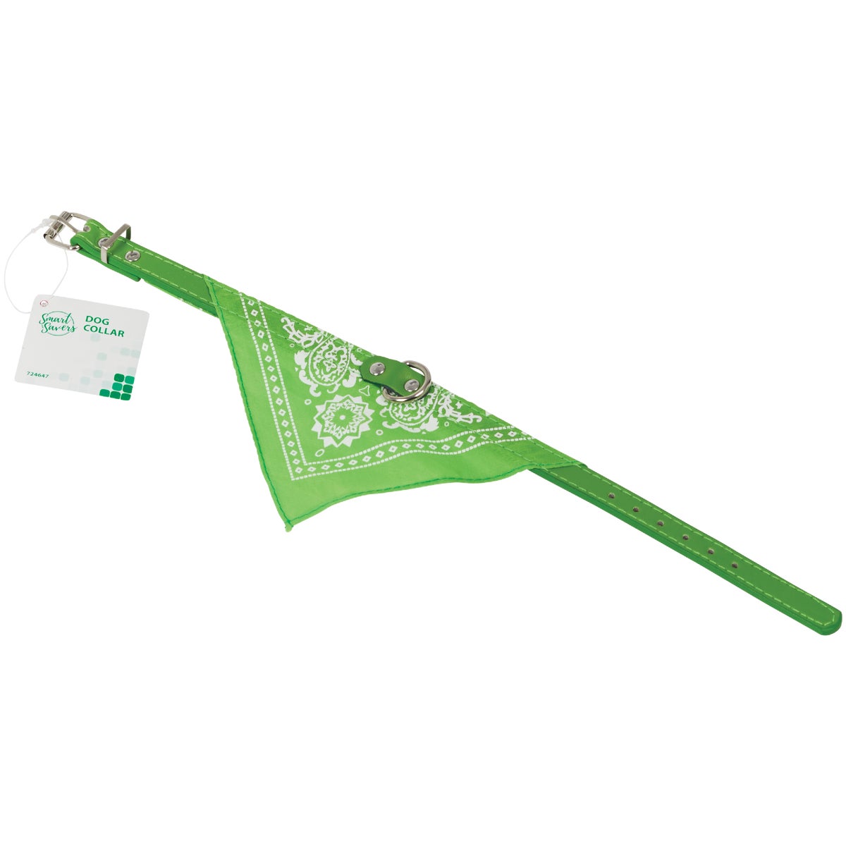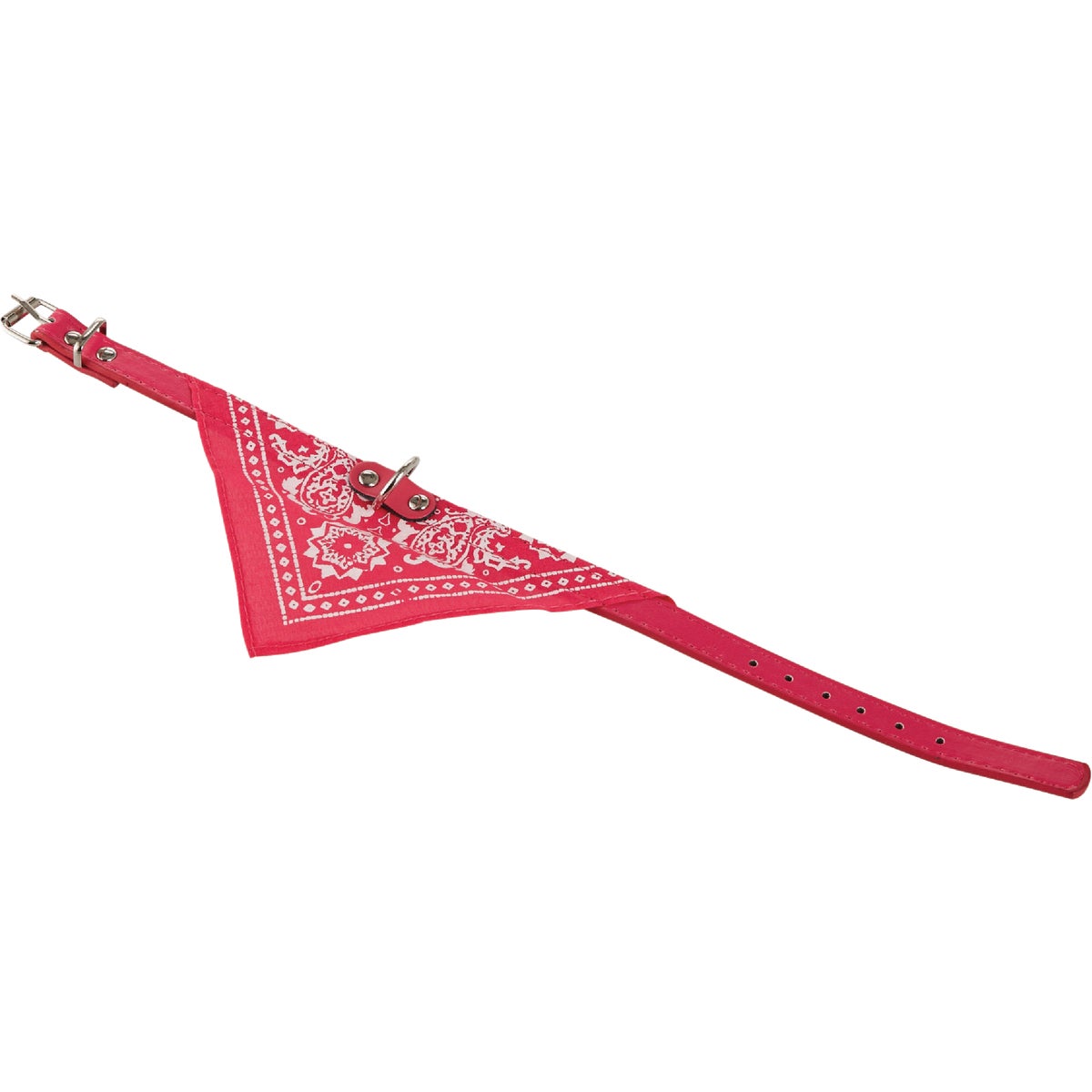 Durable nylon dog collar. Features an adjustable design for a safe and easy fit. Includes a fun, matching-color bandana and a leash loop to make taking your dog for a walk fun and safe. Available in an assortment of colors: red, green, and black. Cannot specify color.