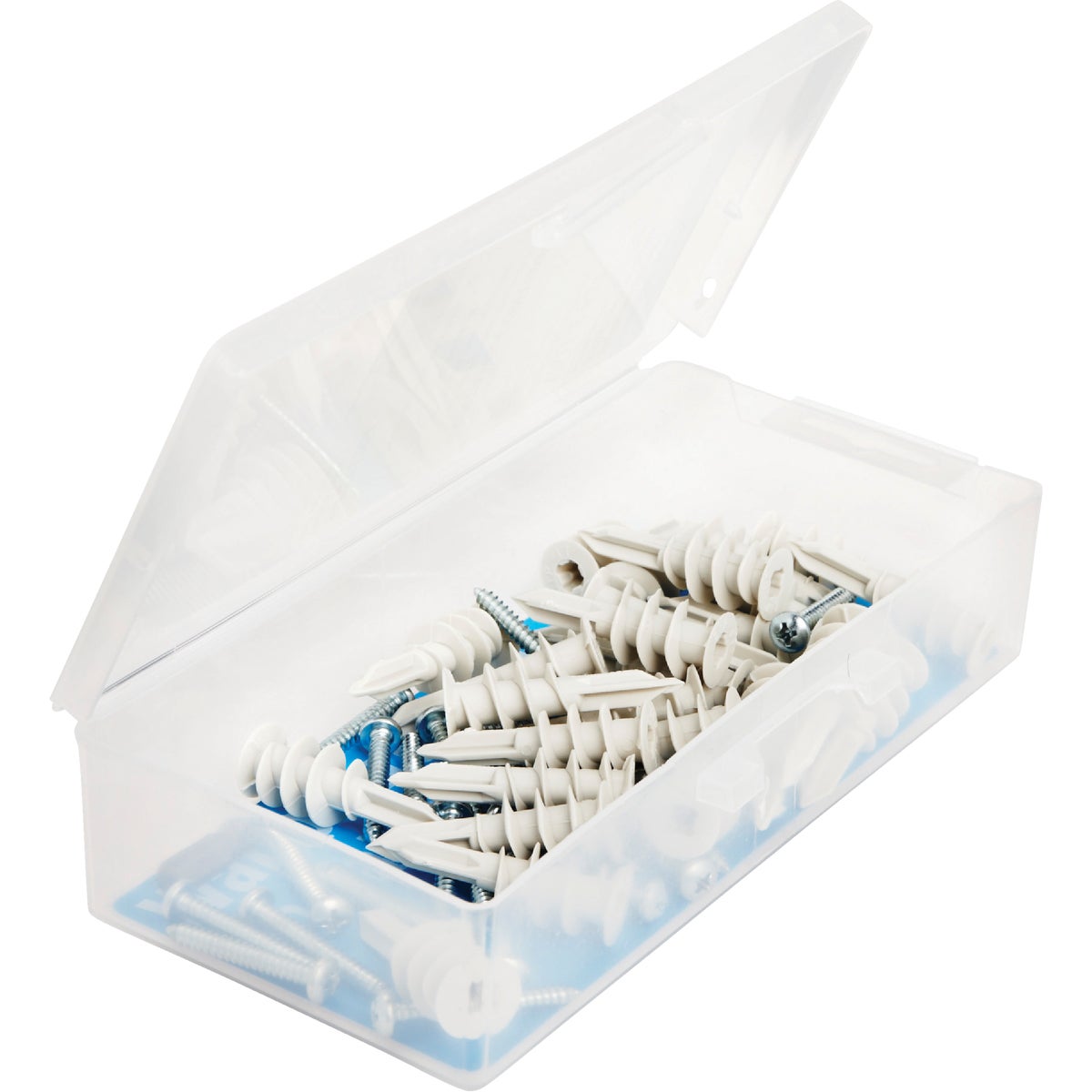 The Wallboard Anchor is a one piece self-drilling anchor designed for use in hollow gypsum wallboard for light to medium duty loads. It is ideal for mounting electrical fixtures, fastening drapery supports, installing phone systems and miscellaneous hardware. Nylon drywall anchors feature a shark's-tooth design to provide correct positioning and quick installation. Includes screws. Use in wallboard, tile, and masonry. For interior and exterior use. 7 sizes in kit.