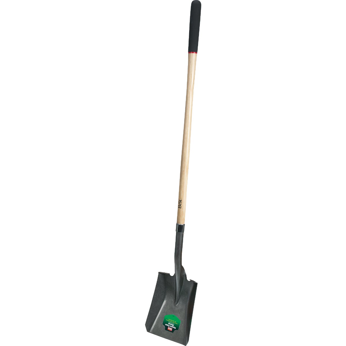 Square point, hollow back garden shovel with 16-gauge, powder coated carbon steel blade and forward turned step. Chrome collar. 49 In. ash wood handle with black 9 In. foam grip. Blade dimensions: 9.3 In. W. x 11.75 In. H. Total length: 60 In.