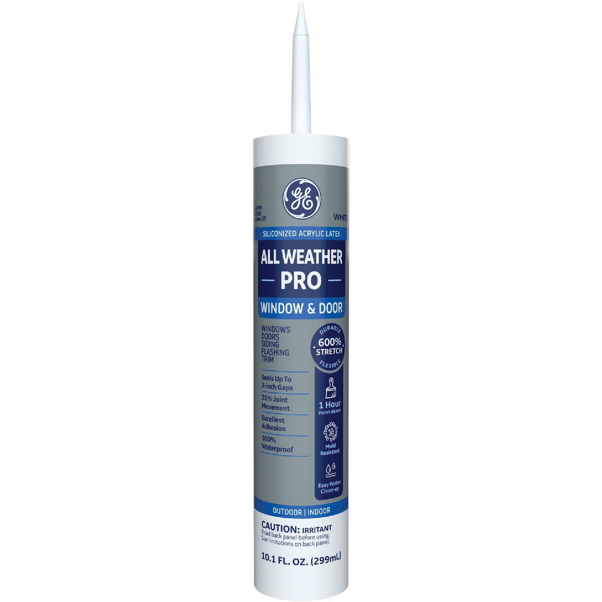 GE-branded All Weather Pro Window & Door Siliconized Acrylic Latex (MAWD310CR) is an advanced-grade sealant ideal for exterior and interior paint projects, such as windows, doors, siding, flashing and trim applications. This formulation offers strong adhesion and excellent flexibility to withstand severe weather conditions. 100% waterproof and weatherproof, All Weather Pro sealant also exceeds ASTM C920, spanning up to 2-inch gaps with 25% expansion and recovery. All Weather Pro sealant is paint-ready in as little as 1-hour for quicker workflow. Cured sealant is resistant to stain-causing mold and mildew growth. Seals are durable and tough for long lasting professional results.