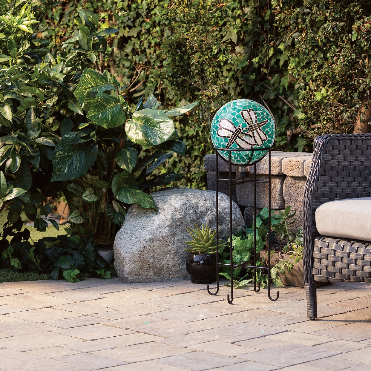 Mosaic glass gazing globe featuring a duo dragonfly design. Made from different colored pieces of glass, this spherical yard art decor provides a unique and eye-catching addition to your home's interior or exterior with its colorful, iridescent dragonfly mosaic pattern design. The multi-use glass gazing ball can be used in a variety of ways, including in your garden, patio, courtyard, or front door entryway or as an accent piece in your living room. Add one or multiple glass orbs to enhance your formal or informal garden's natural beauty with their electrifying colors and iridescent shine. The glass globes create a gorgeous pattern on a flat, even surface like decks, patios, walkways, and sidewalks. Use a metal stand (sold separately) in varying heights to help create visual interest and depth to your lawn. This colored glass gazing ball will add vibrant color and shine to your garden, and will help promote a healthy garden by reflecting light on sunny days. Measures 10 In. Dia. x 12 In. H. Includes a 1-year manufacturer's warranty from date of purchase.