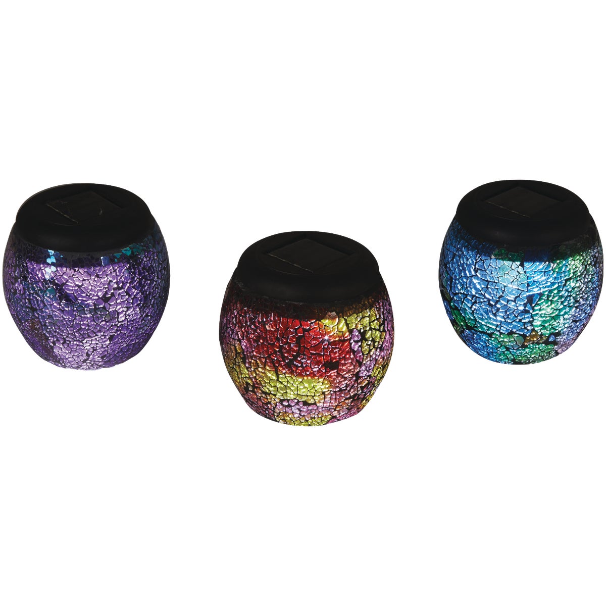 Solar powered mosaic glass jar lantern with LED (light emitting diode) lights. Provides entrancing accent lighting and makes a marvelous addition to any yard or garden. The solar light soaks up the sun's energy during the day which is efficient and cost-saving for hassle-free illumination. Designed in mosaic style and available in red, turquoise, and purple. Cannot specify color. The lights feature a white LED light of 4 lumens that provides quality performance up to 6 to 8 hours. The mosaic jar lanterns are sturdy and weather-resistant, so they can be used in multiple seasons instead of just warm summer nights. These stunning mosaic jar LED lanterns are a practical and stylish solution for any garden, walkway, path, patio, driveway, landscape, and more. Measures 5 In. W. x 5 In. H. x 5 In. L. Includes a 1-year manufacturer's warranty from the date of purchase.