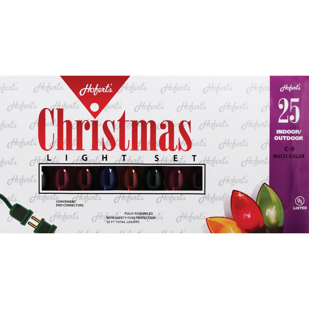 Incandescent holiday string light set. 25-light, C9 incandescent light set with green wire. Features 12-inch bulb spacing, 25.8-feet total length, and 25-feet lighted length. Ideal for indoor or outdoor use. 20-gauge wire with 6-inch lead and 4-inch tail.