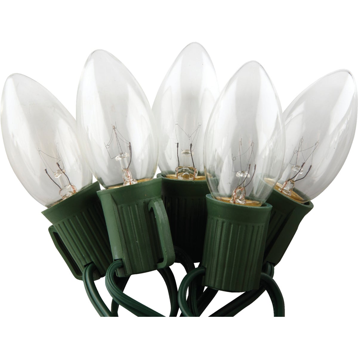Incandescent holiday string light set. 25-light, C9 incandescent light set with green wire. Features 12-inch bulb spacing, 25.8-feet total length, and 25-feet lighted length. Ideal for indoor or outdoor use. 20-gauge wire with 6-inch lead and 4-inch tail.