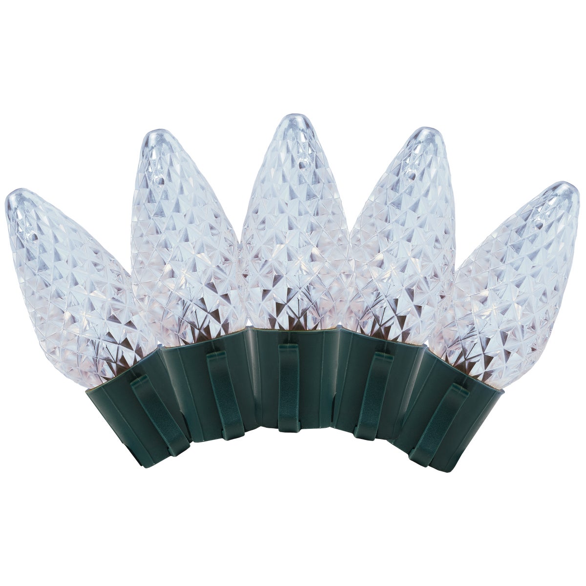 C9 LED (light emitting diode) light set. Features 8-inch bulb spacing, 4-inch lead wire, 4-inch end connect, and 22-gauge green wire. Ideal for indoor or outdoor applications. LED lights have 80 to 90% energy savings and are tested for 20 years/100,000-hour life span. UL (Underwriter's Laboratories) listed.