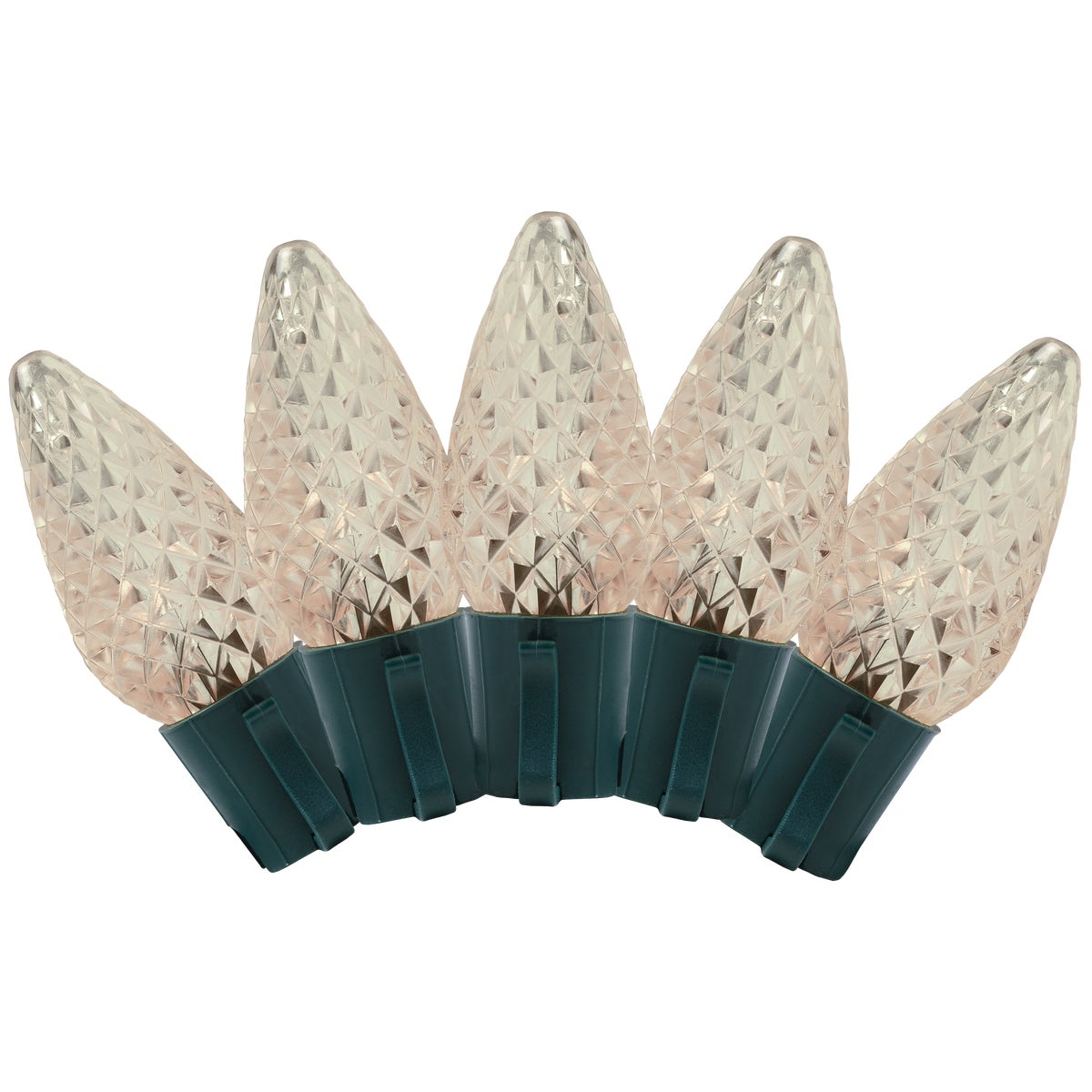 C9 LED (light emitting diode) light set. Features 8-inch bulb spacing, 4-inch lead wire, 4-inch end connect, and 22-gauge green wire. Ideal for indoor or outdoor applications. LED lights have 80 to 90% energy savings and are tested for 20 years/100,000-hour life span. UL (Underwriter's Laboratories) listed.