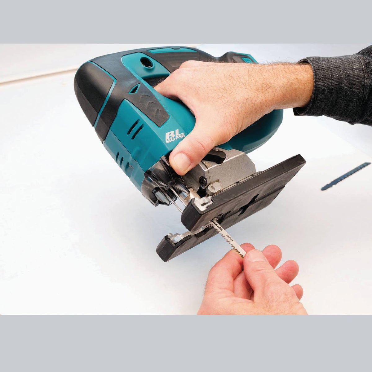 The XVJ02Z features a brushless motor and has 3 orbital settings plus straight cutting for faster and more accurate cuts in a variety of materials. The variable speed control dial (800-3,500 SPM) enables users to match the speed to the application. In addition, the efficient BL Brushless motor is electronically controlled to optimize battery energy use for up to 50% longer run time per charge than similar non-brushless tools. Electronic controls efficiently use battery energy to match the changing demands of the application for increased power and speed when needed. And since there are no carbon brushes, the BL Brushless motor runs cooler and more efficiently for longer life. Convenience features include a tool-less blade change system that allows for faster blade installation and removal, and a large 2-finger variable speed trigger with lock-on button. The heavy-gauge aluminum base is engineered for smooth, accurate cutting and added durability, and the dual LED lights illuminate the work area. It weighs only 5.8 Lb. with battery (sold separately). Tool Only - battery sold separately.