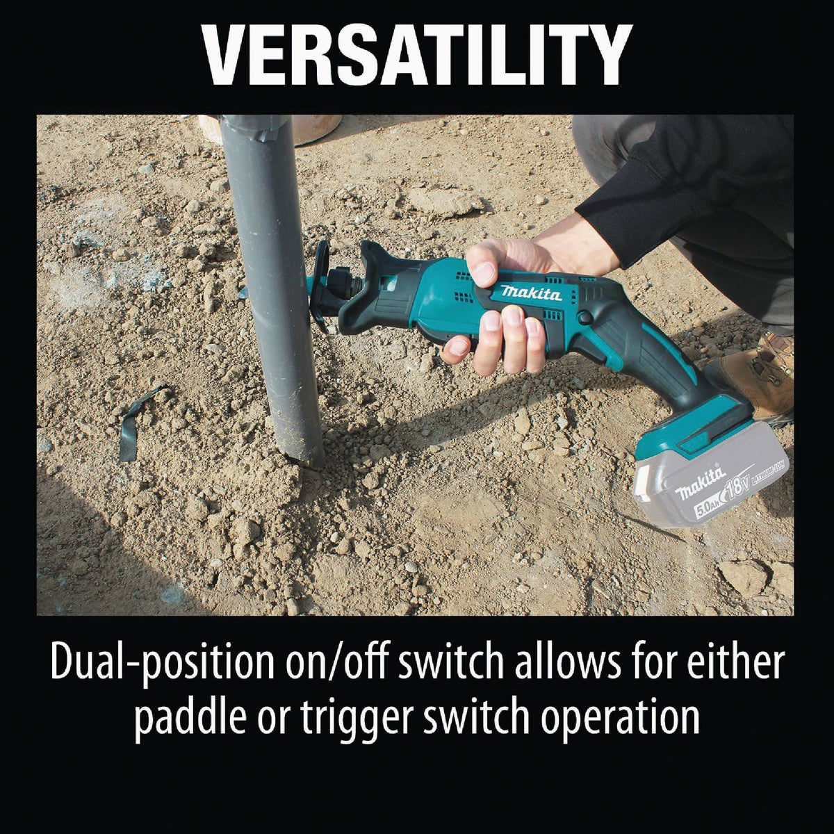 The 18V LXT Lithium-Ion Cordless Compact Recipro Saw (model XRJ01Z, tool only) is a versatile cutting solution that combines variable speed and 1/2 In. stroke length with an exclusive dual-position on/off switch that allows for either paddle or trigger switch operation. Contractors get faster, more efficient cutting along with the convenience of tool-less blade changes and a fast charge time. Tool Only - battery and charger not included.