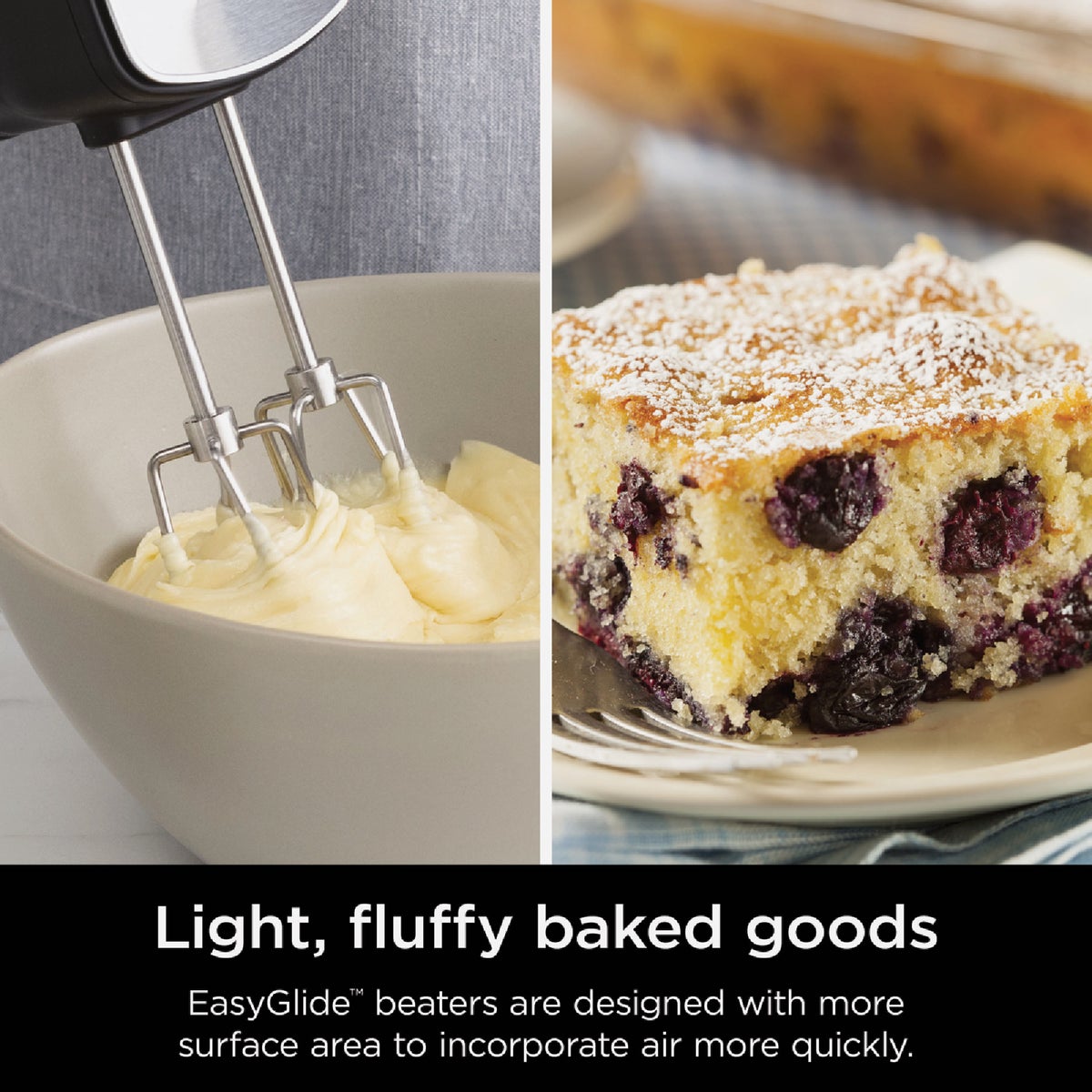 With the Ninja Foodi Power Mixer System, you can tackle all your essential food prep tasks in no time. Its 750-peak-watt power-dense motor lets you power through tough ingredients, evenly mix cookie dough, and blend drinks or soups. Simply connect the PowerBase with one of two attachments to transform it into whatever you need it to be. Mix, whisk, and blend all in one. The 750-peak-watt PowerBase transforms to a high-speed hand mixer and powerful immersion blender. The PowerBase detects the attachment, giving you complete control across 5 Mixing & 2 Blending speeds. Powerful EasyGlide beaters are designed with more surface area to incorporate air into the batter more quickly for light, fluffy baked goods. 9 stainless steel immersion blending arm comes with built-in pan guard allowing you to blend directly in deep pots or pans without scratching them. Designed for the thickest food loads, SmartTorque maintains your blending or mixing speed to deliver an uninterrupted, smooth performance. Dishwasher safe parts make cleanup a breeze and can be easily stored in your kitchen drawer. Includes: PowerBase with 5 ft. Cord, 9 In. Immersion Blending Arm with stainless steel blade and built-in pan guard, Hand Mixer attachment with Whisk & EasyGlide Beaters, 3-Cup Blending Vessel with storage lid and 20-recipe inspiration guide.