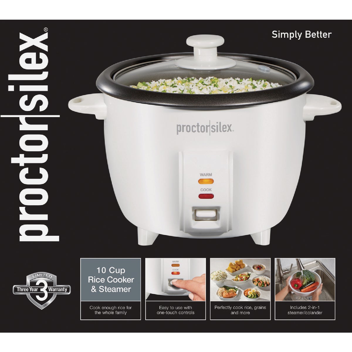 Perfectly cook your favorite rice and grains in the Proctor Silex Rice Cooker & Steamer. Whether you're cooking oatmeal for breakfast, preparing a side of brown rice, or steaming vegetables and fish, you can do it all with the press of one button. The steamer basket on the cooker doubles as a colander for rinsing vegetables before cooking, or use it to steam everything from salmon to Brussels sprouts. No watching required. Rice cooks perfectly on its own, giving you time to prepare the rest of your meal, then it automatically switches to keep warm when cooking is complete. Theres no need to worry about boiling water, adjusting temperatures or setting timers. Cleaning up is simple too. The removable bowl, steamer basket, and lid are all dishwasher safe, while other accessories are top-rack dishwasher safe. This rice cooker includes the 2-in-1 steamer basket, rice measuring cup and spatula. Backed by a 3 year limited warranty.